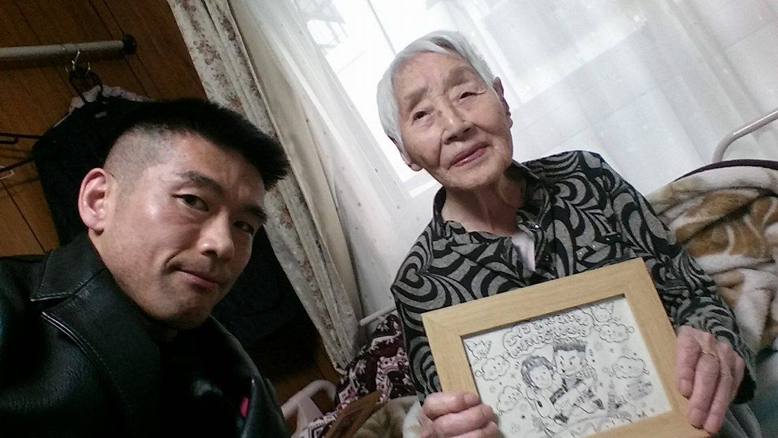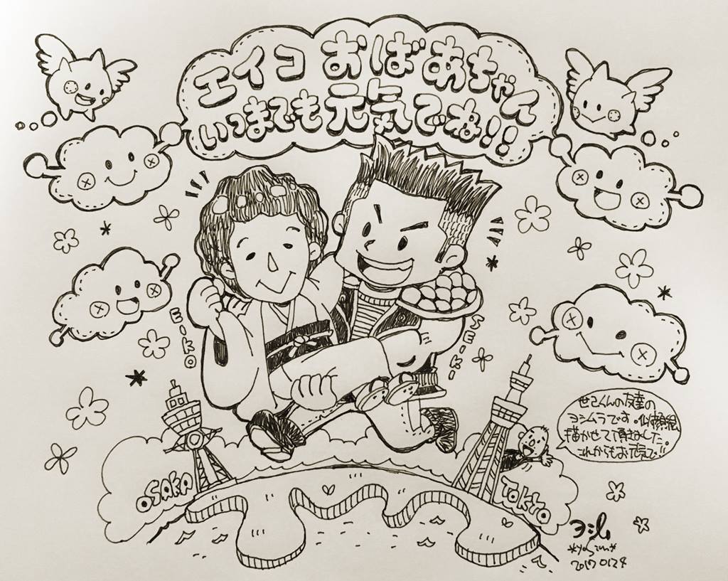 この日は前日に「明日大阪出張で、今日の夕方出発なんでそのついでに婆ちゃんの見舞いにも行くんですよ」と話していたんですが、その後「おばあちゃんの似顔絵書きたいから写真とかある?」とメールが着信、少し古い写真ながら一枚あったのを送信したところ「今から描く!出発までに描けるところまで描く!」と言ってくれ、売れっ子イラストレーターがスキマ時間で必死に信じられないような短時間で書き上げてくれたのがこれです。