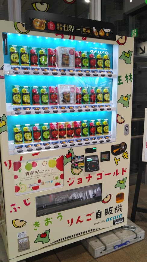 果物をほとんど食べない僕が例外的に食べられる数少ない果物の一つ、林檎さんの名産地ということもあって「美味しいのあるかな?」と思いながら駅構内を歩いていると・・・一風変わった自販機が・・・