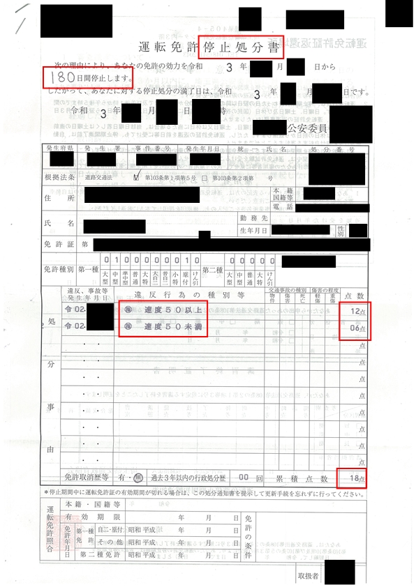 こちらはまず前歴無しの12点で90日の免許停止に該当し、その処分を受ける前に6点追加で合計18点で免許取消に該当してしまった状態です。