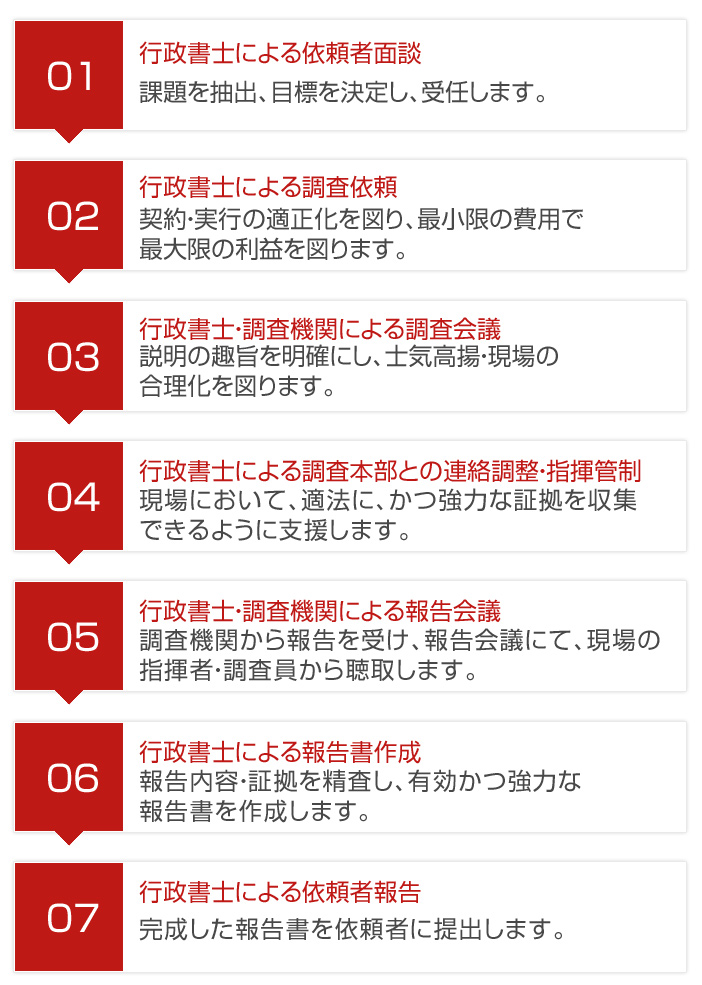 調査報告書は、書類作成の国家資格紗である行政書士が執り行いますので、厳格に、適切に作成されます。