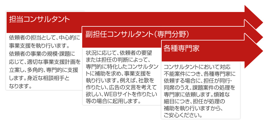 また、案件の内容によって異なりますが、専門家との煩雑な打ち合わせ・会議等は担任コンサルタントに任せ、依頼者本人は本来の経営業務に専念することができます。
