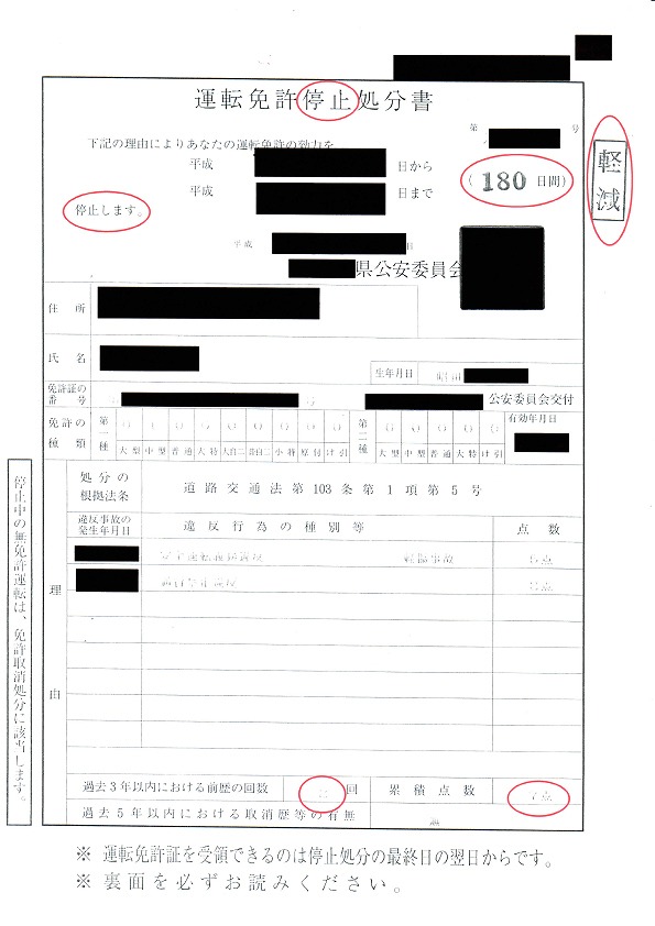 ⇒180日の免許停止に軽減成功
