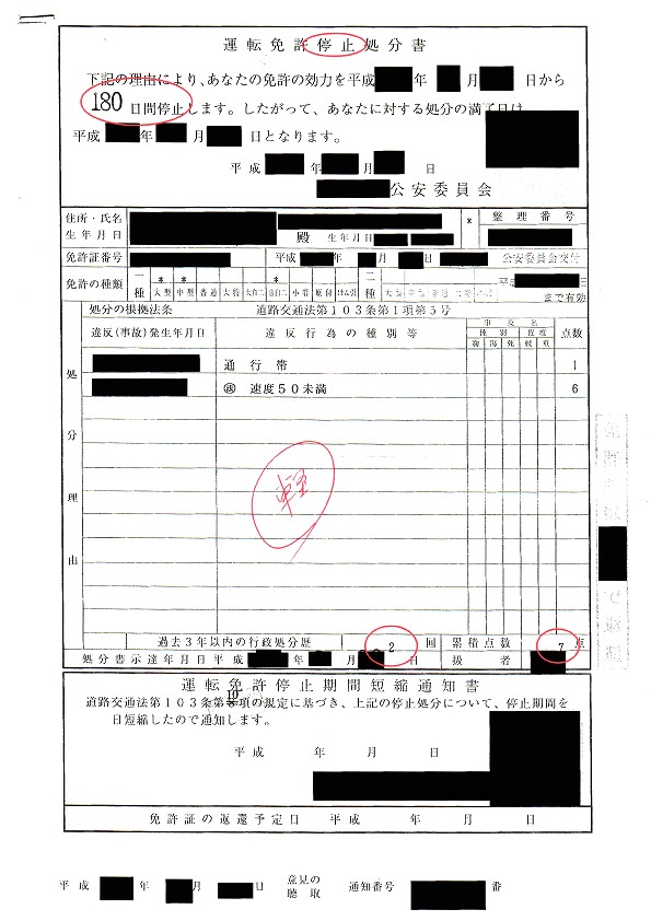 前歴2回+通行禁止違反で1点+スピード違反で6点、合計7点で免許取消